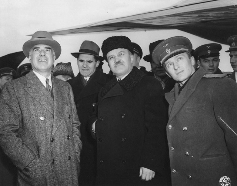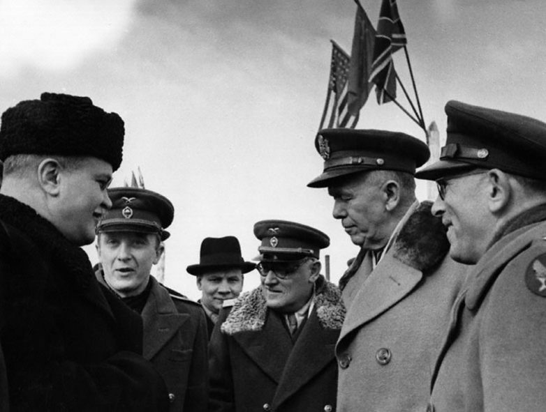33. Президент США Франклин Рузвельт (Franklin D. Roosevelt, 1882—1945) разговаривает с Наркомом иностранных дел СССР Вячеславом Михайловичем Молотовым (1890—1986) на аэродроме Саки в окрестностях Ялты. На втором плане третий слева — Нарком ВМФ СССР адмирал флота Николай Герасимович Кузнецов (1904—1974).