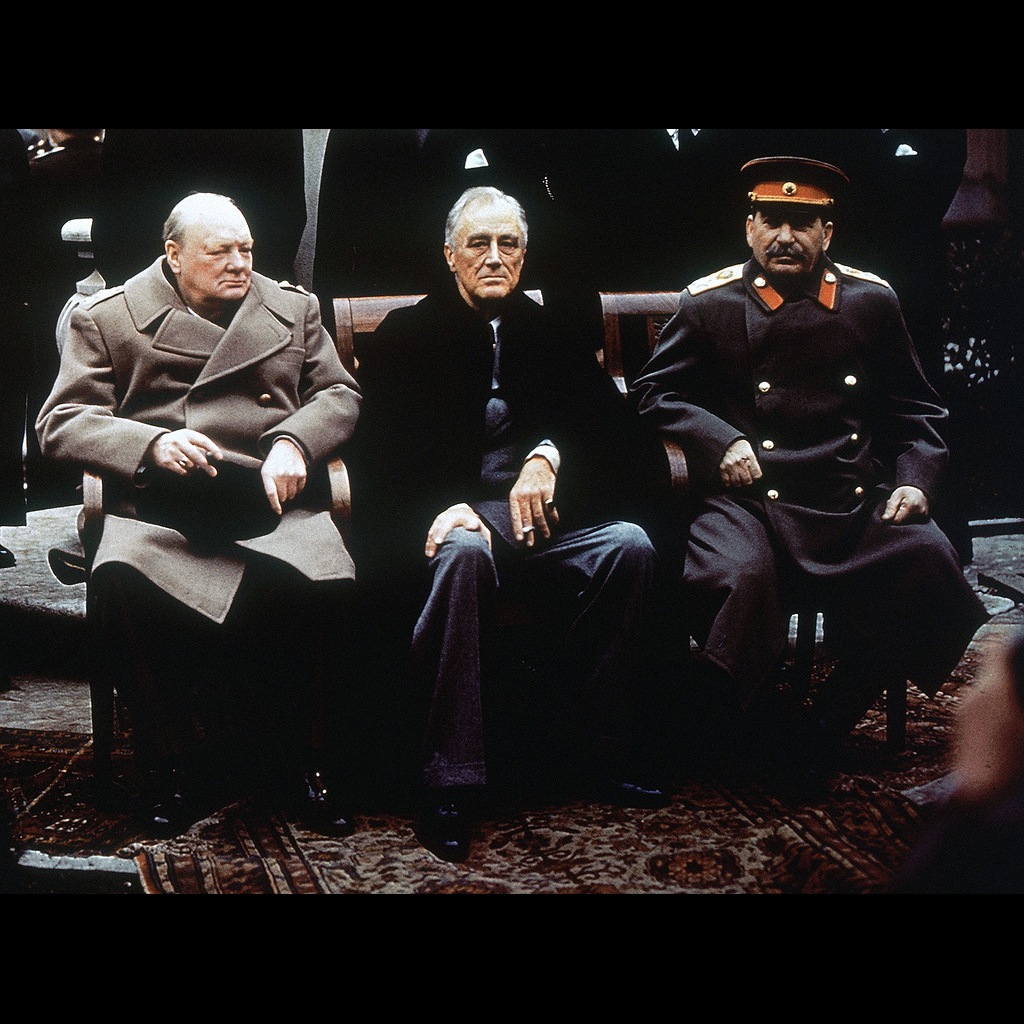 37. Маршал Советского Союза, председатель СНК СССР и председатель ГКО СССР Иосиф Виссарионович Сталин, премьер-министр Великобритании Уинстон Черчилль (Winston Churchill, 1874—1965) и президент США Франклин Рузвельт (Franklin D. Roosevelt, 1882—1945) на банкете во время Ялтинской конференции.