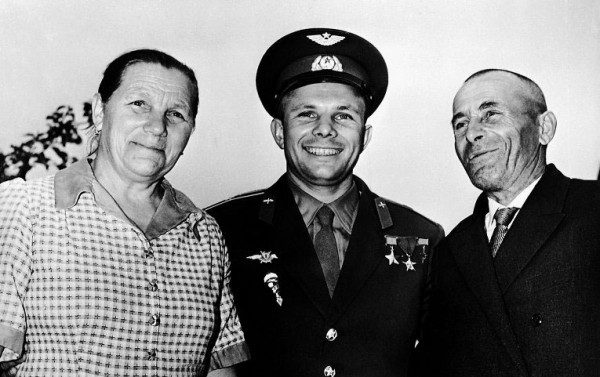 Юрий Алексеевич Гагарин на родине в Гжатске. Слева — его мать Анна Тимофеевна, справа — отец Алексей Иванович