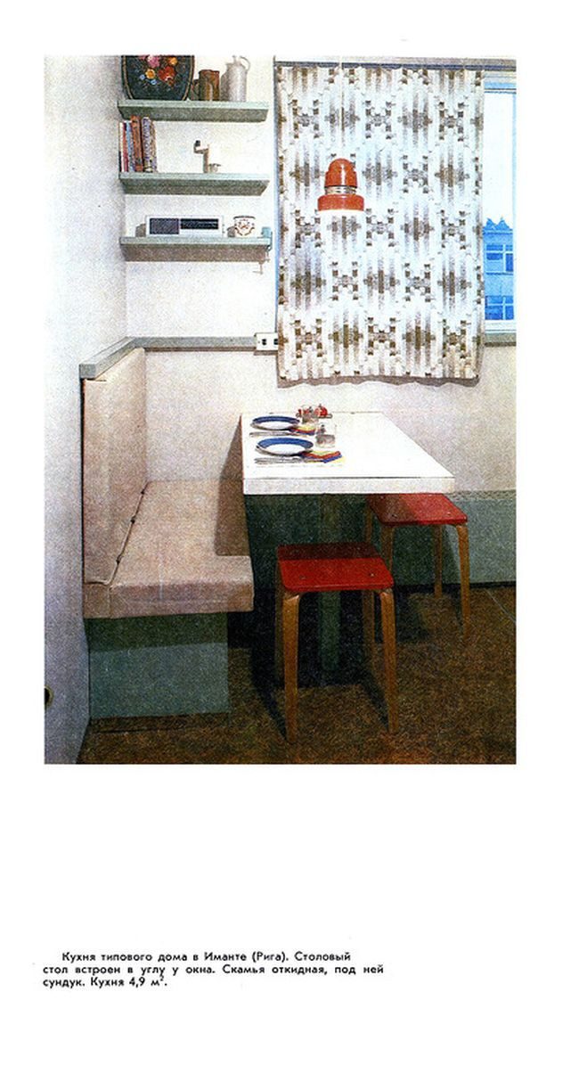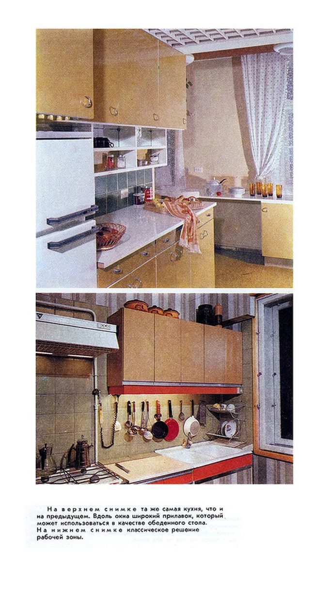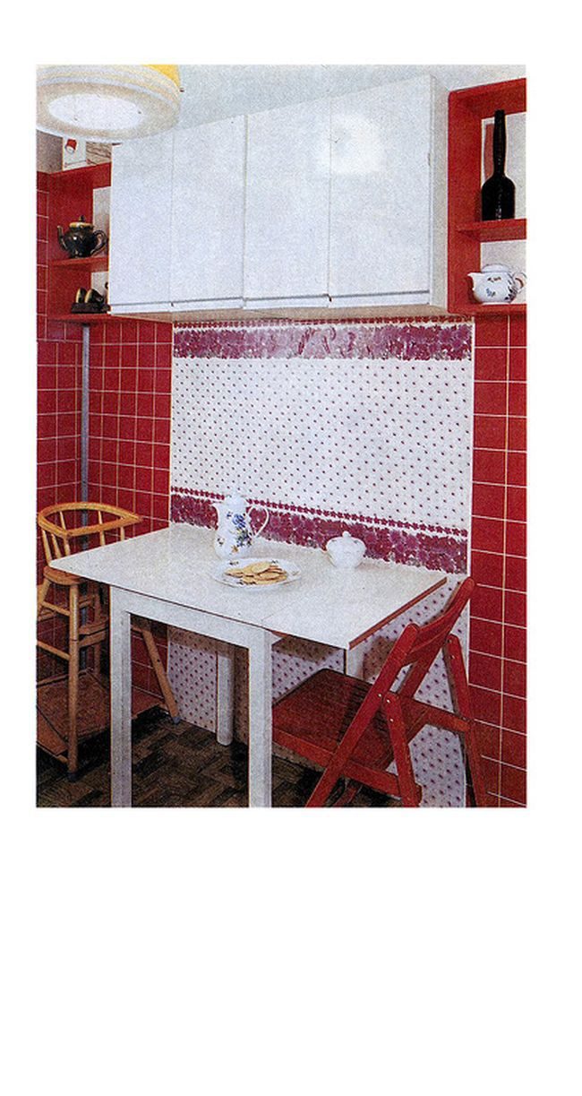 Не особо отличается от нынешней мебели. Прямые линии, простота формы. Вот только обилие книг… В открытых полках они создают ощущение захламленности. Красные колготки над плитой в красной кухне порадовали)))