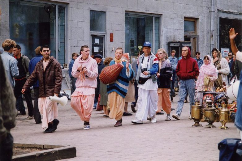 2. К концу 1980-х годов, когда уже отгремели столкновения между рокерами и люберами — о них писала даже New York Times, — на улицы Арбата кто только не повылазил. В том числе появились кришнаиты, которые своим несуразным внешним видом и бубнежкой надоедали окружающим не меньше, чем моторокерские банды.