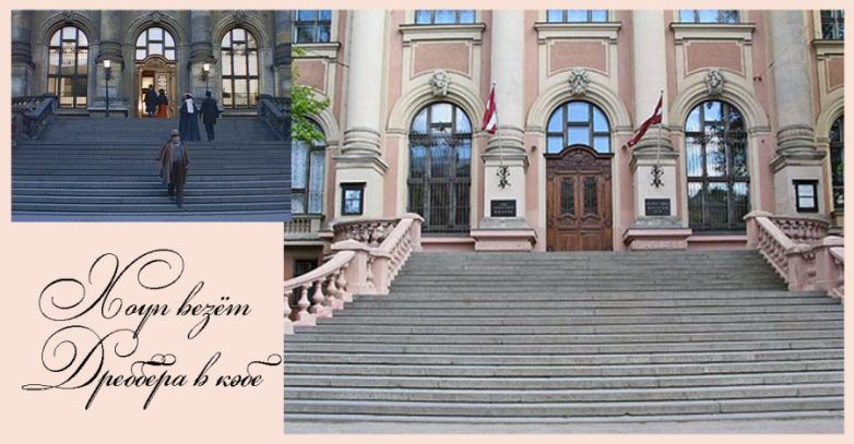 Крайнее справа здание, от которого виден лишь угол – Музей истории Риги и мореходства. Большой портал вдали справа – это вход в Домский собор. Собор заложен в 1211 г. основателем Риги епископом Альбертом Буксгевденом, завершен около 1270 г. неизвестным мастером из Кельна. С тех пор и до конца XIX века собор постоянно перестраивался, вбирая в себя признаки разных архитектурных стилей. После реставрации (1959-60 гг.) собор, обладающий хорошей акустикой и одним из лучших в бывшем СССР и одним из крупнейших в мире органов, был преобразован в концертный зал-музей. Ныне передан в собственность Латвийской евангелическо-лютеранской Церкви, но в специально отведенные часы здесь проводятся концерты органной музыки. Кстати, слева от кинооператора, скрытый от наших глаз, находится памятник Гердеру. А фонарь на углу – бутафорский