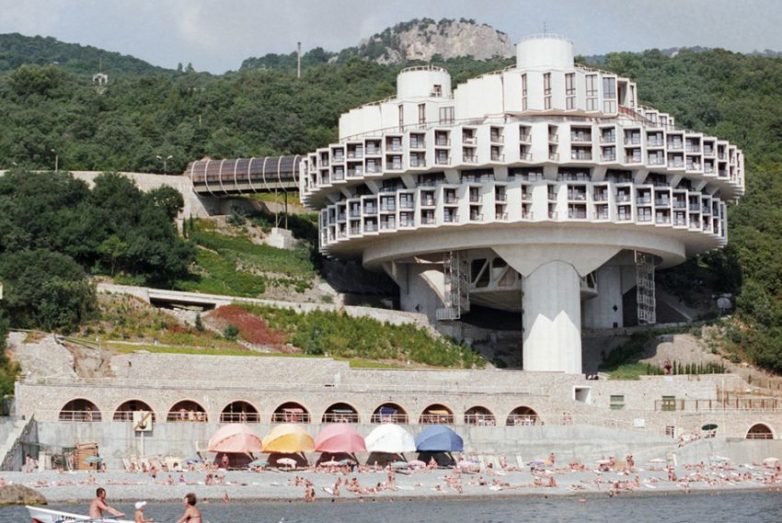 Пансионат «Дружба» в Ялте. Здание построено на берегу моря, на крутом склоне. Пятиэтажную жилую часть держат три башни-опоры, внутри которых расположены лифты и лестницы. Внутри между опорами находится круглый бассейн. Пансионат сдан в эксплуатацию в 1985 году.