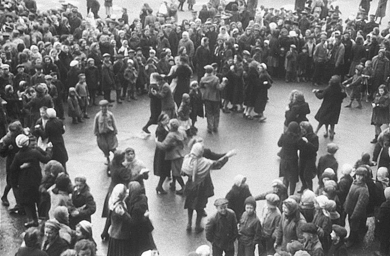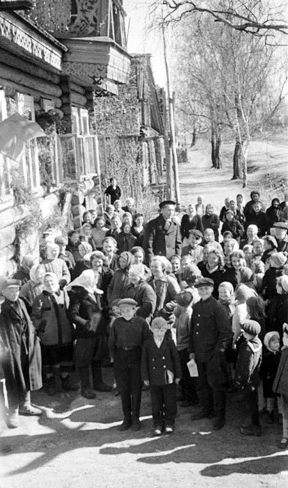 Ликующие жители на улице колхоза «Новый путь» Лужского района