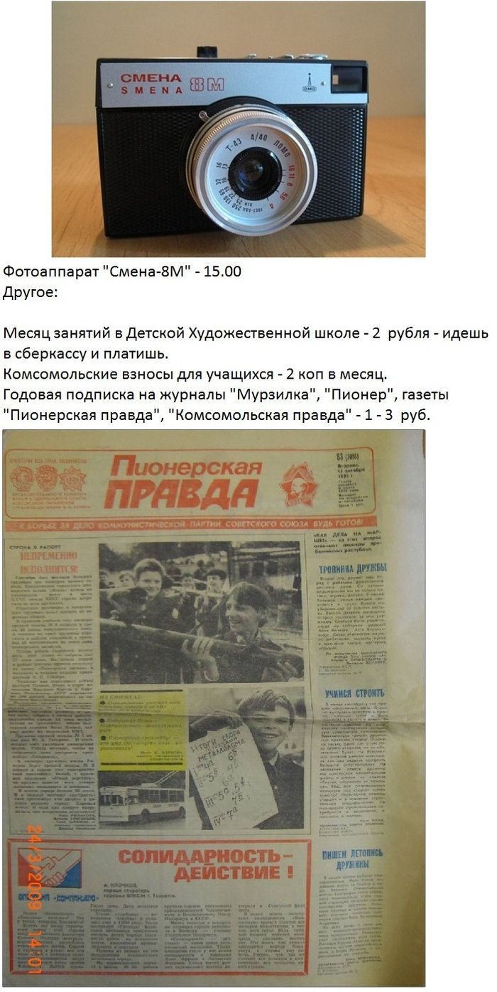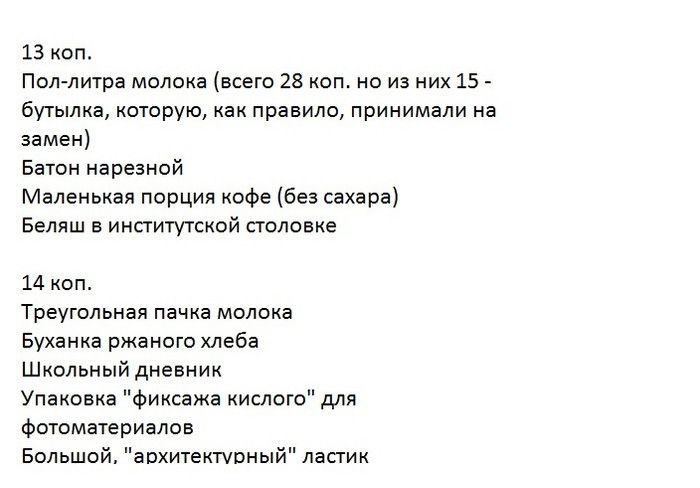 В начале 70-х пирожок с мясом 10 к, фруктовое мороженое 7 коп, колбаса 2.20, резиновое изделие №2 — 4 коп, вино «Салют» 2.50, водка «Сибирская» (45 градусов) 6 руб (вроде), детская педальная машина 25 руб, папиросы «Чайка» 7 коп.