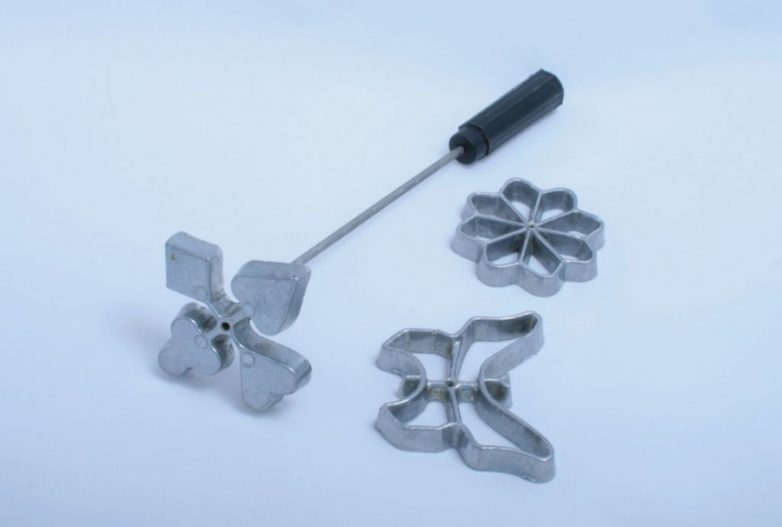 Еще один «девайс» для продвинутых советских хозяек. Приспособление для выпечки хвороста. Сменные металлические формочки навинчивались на рукоятку. Затем окунались в специально приготовленное жидкое тесто (с добавлением водки!) и затем – в кипящее масло. Тесто зажаривалось в виде хрусткой поджаристой бабочки или цветочка.