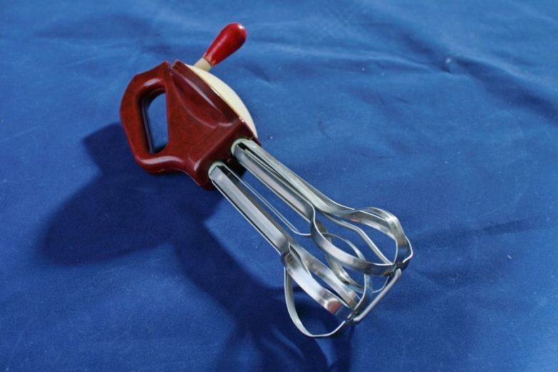 Это – предшественник современных миксеров. Ручная взбивался для крема. Шедевр советской инженерной мысли, пользовавшийся неизменной популярностью у хозяек. В качестве альтернативы выступали похожий ручной агрегат, навинчивавшийся на стеклянную банку. В этом случае сверху (как в кофемолке) нужно было крутить ручку, приводящую в движение лопатки взбивалки в банке. А также начавшие появляться в середине 1960-х электромиксеры производства ГДР.