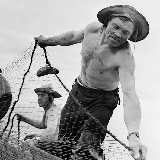 Вместо парадов репортеры все чаще снимают повседневный быт, а сцены героического труда становятся более будничными, хоть и овеянными романтикой. (Ю.Абрамочкин. Сибирь. Байкальские рыбаки. (1970-е)).