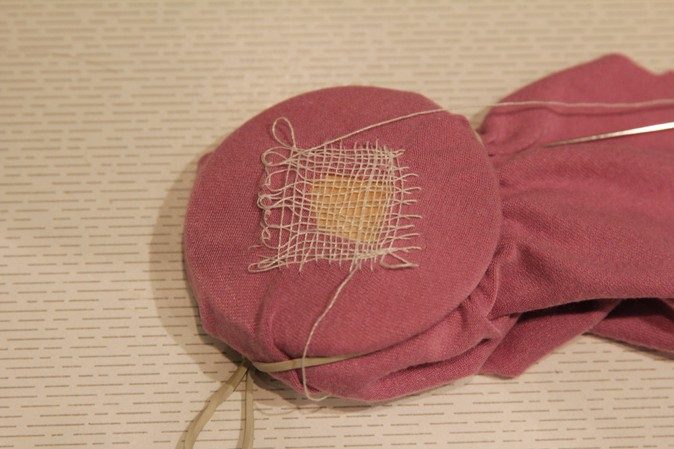 Грибок с восстановленной тканью снят с машинки, снятые с крючков нитяные петли пришил к ткани.