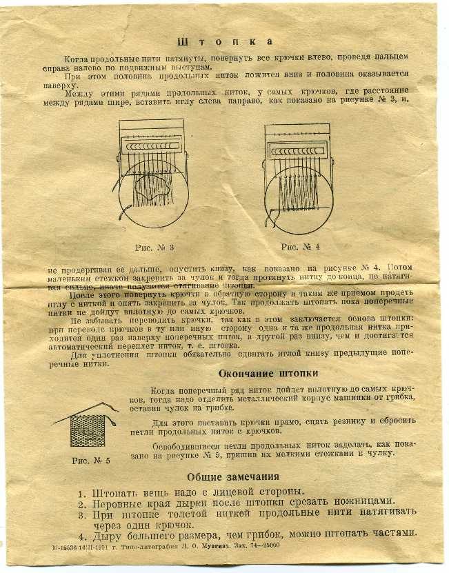 Разработали машинку для штопки, изготовили на Промкомбинате Свердловского райсовета г. Ленинграда. Упаковали, развезли по стране. Одну штуку купила моя бабушка Александра, но никогда не ею не пользовалась. Так и пролежал сей девайс с 1951 года в коробочке. А в конце 2013 я ее достал, отсканировал инструкцию и вывесил в ЖЖ. На днях добавлю фотографии самого процесса штопки.