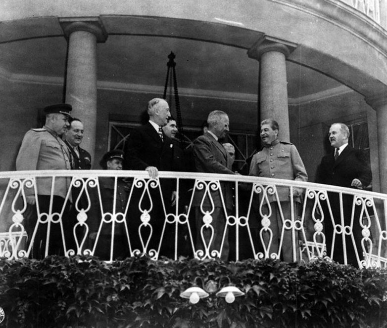 Советские высшие офицеры (в белой форме слева направо): Начальник Генерального Штаба РККА — генерал армии Алексей Иннокентьевич Антонов, маршал авиации РККА Фёдор Яковлевич Фалалеев. Американские офицеры (сидят справа налево): генерал-лейтенант Генри Арнольд, начальник штаба армии США генерал Джордж Маршалл, начальник штаба морских операций адмирал Эрнст Кинг.
