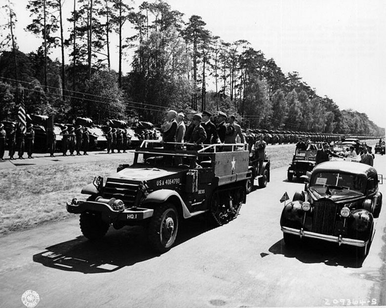 15. Проезд военных советников и представителей Объединенного штаба союзников (слева направо): первый ряд – Дж. Маршалл, А. Брук, маршал авиации Ч. Портал, генерал Г. Исмей; второй ряд – адмирал Э. Кинг (США), адмирал Э. Канингхэм (Великобритания).