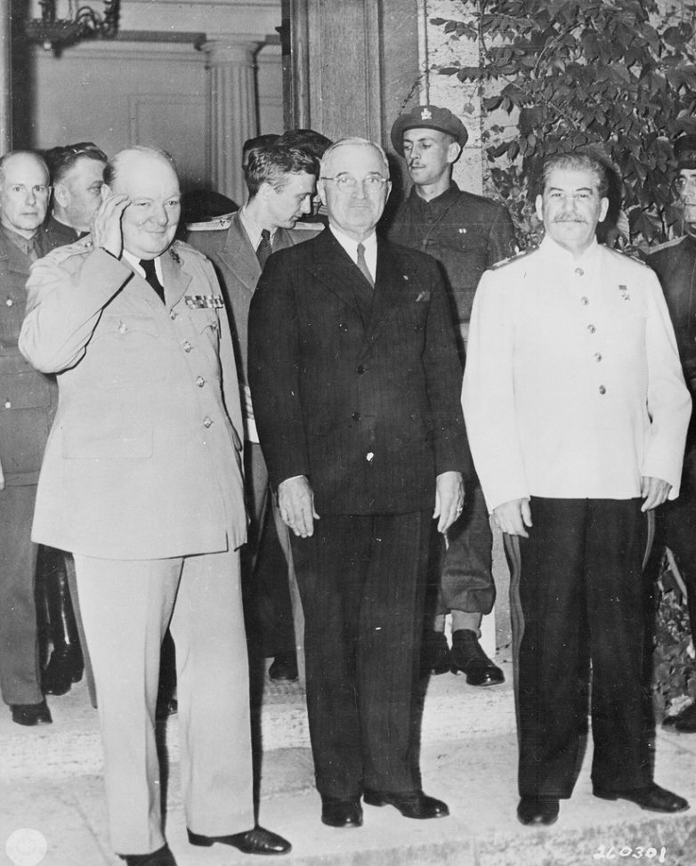 61. Маршал Советского Союза, председатель СНК СССР и председатель ГКО СССР Иосиф Виссарионович Сталин, президент США Гарри Трумэн и премьер-министр Великобритании Уинстон Черчилль в перерыве между заседаниями на потсдамской конференеции.