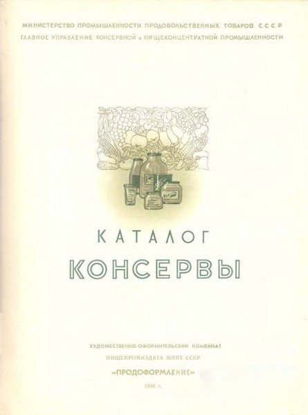 Позвольте предложить Вашему вниманию каталог, подготовленный Министерством промышленности продовольственных товаров СССР, Главным управлением консервной и пищеконцентратной промышленности и ХОК Пищепромиздата МППТ СССР «ПРОДОФОРМЛЕНИЕ» 1956 года.