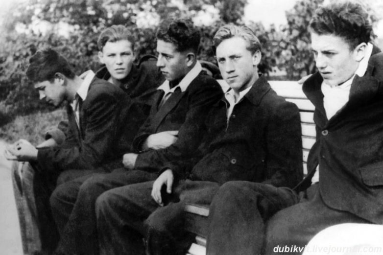 Владимир Высоцкий с одноклассниками, живущими на Большом Каретном (В.Агеев, В.Акимов, А.Якушев, В.Высоцкий и Р.Денисов), перед выпускным вечером на ВДНХ. Фото Романа Денисова, июнь 1955 год