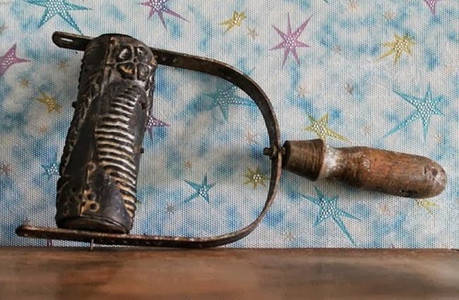 А это штуковина для нанесения орнамента на оштукатуренную стену. На резиновом валике был рисунок, валик макали в серебрянку и прокатывали по стене. Обои тогда были в дефиците. Наносить накат не приходилось, но вот жить в комнате, таким способом отделанной – да.