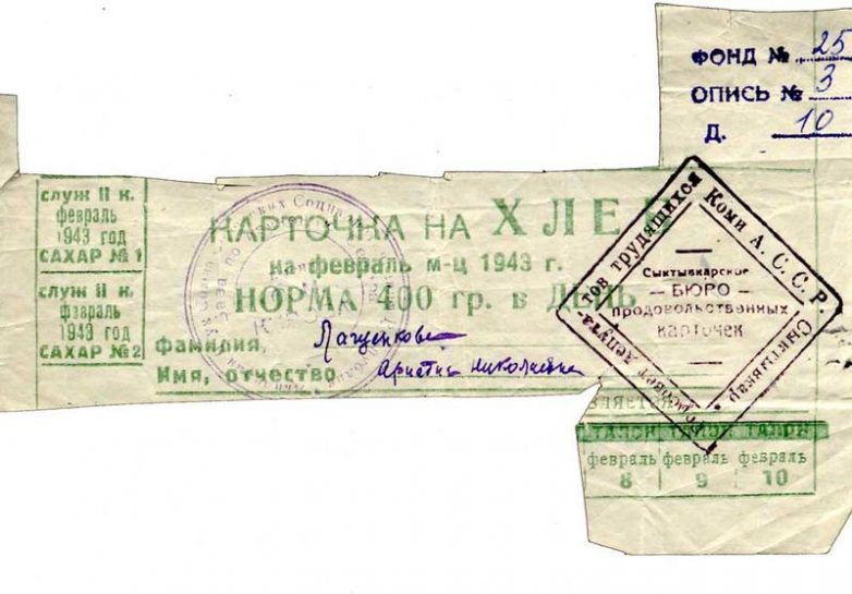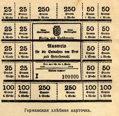 В 1916 году норма выдачи хлеба рабочим в Петрограде была установлена в размере 1 фунта в день (1 русский фунт — 0,4 кг). Для сравнения: германская хлебная карточка (на фото внизу) предусматривала, что каждому немцу положено в день 250 граммов хлеба.
