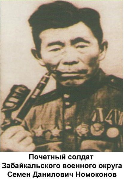 Ему шел 41 год, когда началась война. Семен Данилович Номоконов из Читинской области был зачислен в эвако-хозяйственный взвод 348-го стрелкового полка. В красноармейской книжке он значился как малограмотный плотник. Также имелась запись о его национальности — тунгус-хамнеган. За спиной осталась непростая жизнь. С семи лет он уже не расставался с ружьем. С 1919 года он, женившись, жил в берестяном чуме на берегу реки Урульги. Зарабатывал на хлеб охотой, растил шестерых детей. Но «черная рука беды» забралась в его дом. От скарлатины умерли его четверо сыновей и дочь. Не пережив горя, скончалась жена. Выжил только сын Володька. За ребенком нужен был присмотр, поэтому Семен женился вторично на одинокой девице Марфе, которая настояла на оседлом образе жизни в коммуне «Заря новой жизни». Так он стал плотником в таежном селенье Нижний Стан, откуда был мобилизован Шилкинским райвоенкоматом на войну.