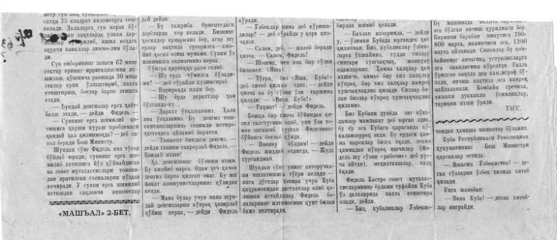 »Я училась тогда в 3 классе и помню, как мы всей школой стояли на центральной улице тогда ещё посёлка Тойтепа и приветствовали проезжавший кортеж с Н. С. Хрущёвым и Кастро. Мой папа был в те годы первым секретарём Среднечирчикского райкома партии и сохранил эту вырезку из газеты. Дата снимка написана его рукой. На обороте — (к сожалению, неполный ) репортаж об этом событии." (воспоминания Д.Бердиевой)