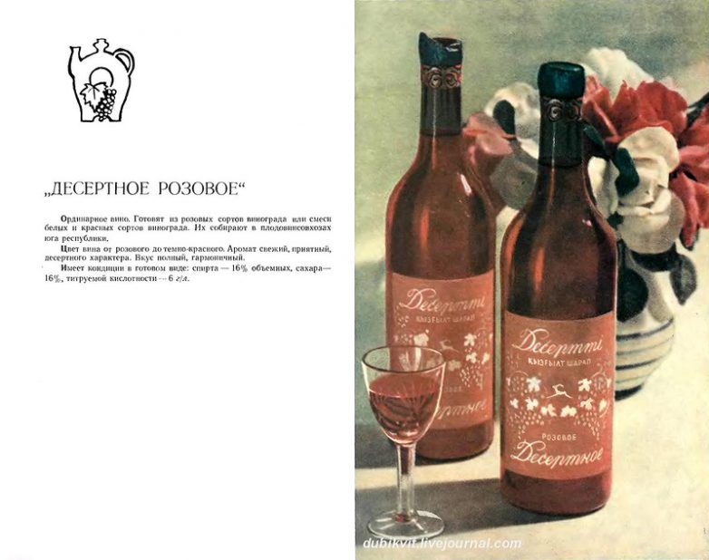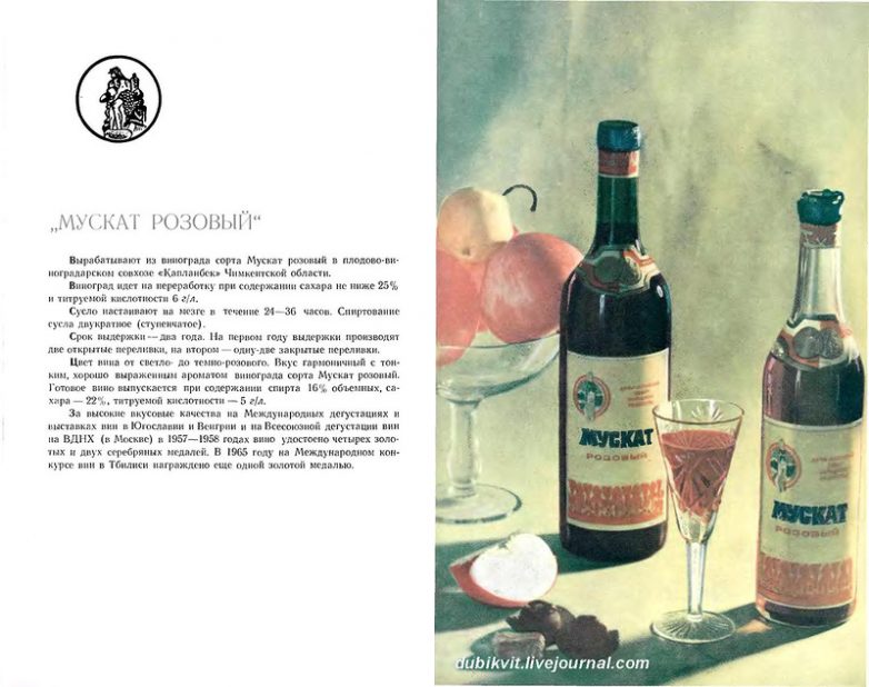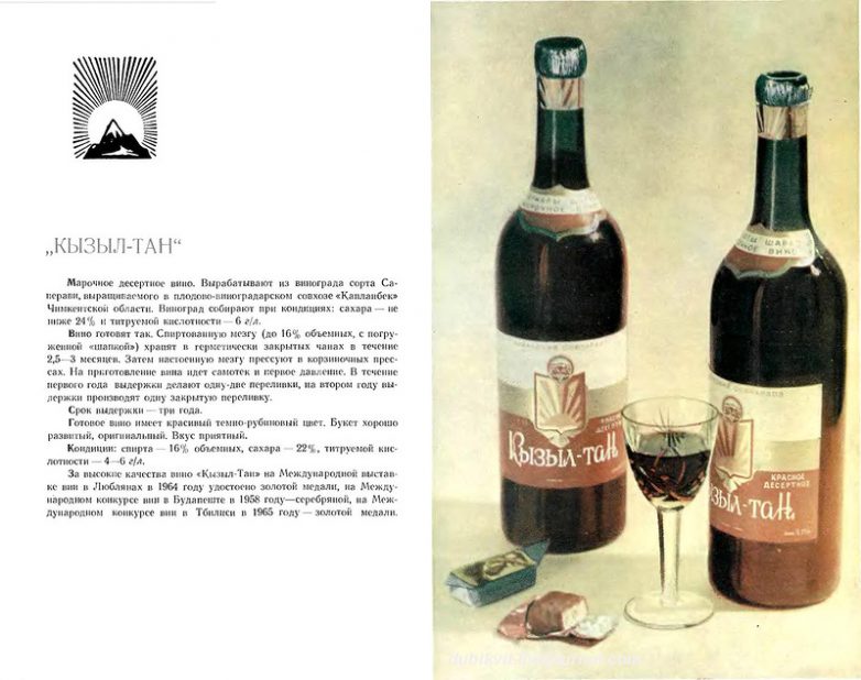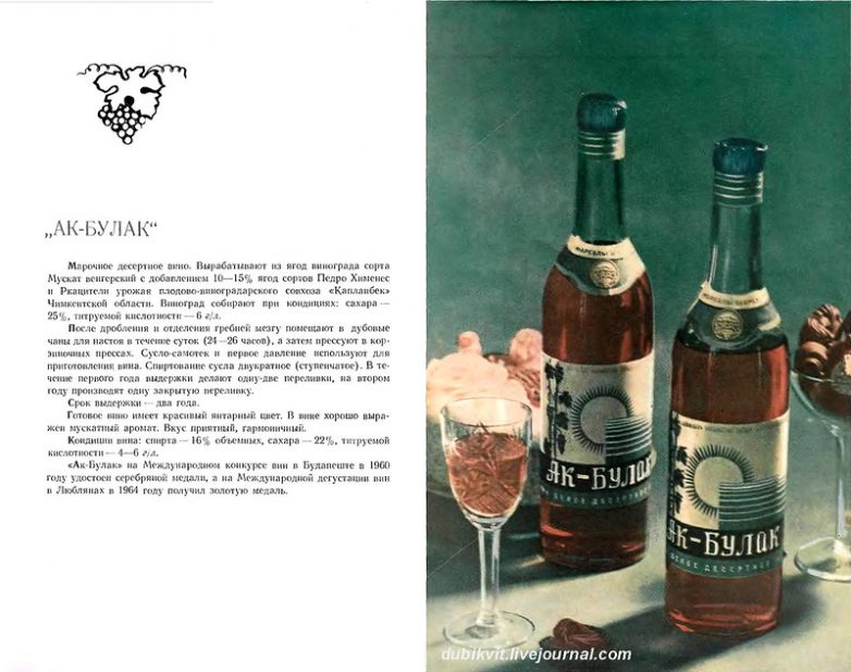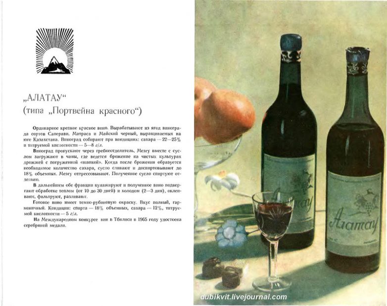 Книга-альбом «Вина и шампанское Казахстана», подготовленная Министерством пищевой промышленности Казахской ССР в 1965 году. В настоящей книге-альбоме содержатся краткие сведения по технологии приготовления виноградных вин всех марок и шампанского Казахстана. Приводятся исторические справки по виноградарству и виноделию республики.