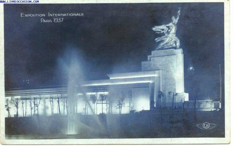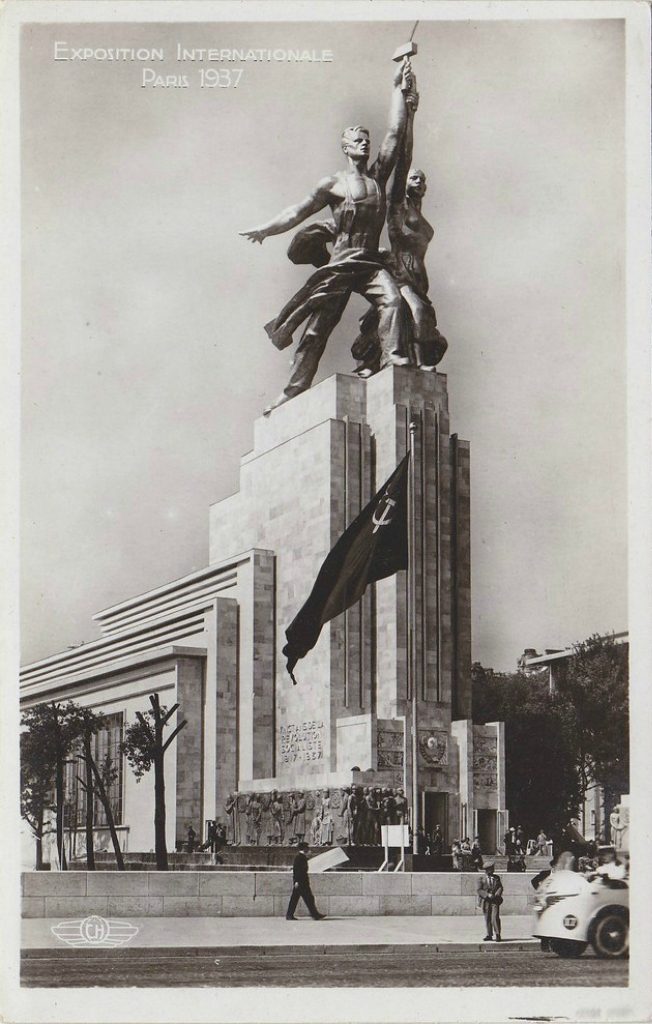 По Парижской выставке 1937 г. был проведен закрытый конкурс. В нем участвовали крупнейшие мастера советской архитектуры. Проект Б. Иофана был признан лучшим. В проекте мастер необычайно лаконично и впечатляюще выразил главную идею. Это был павильон-постамент, динамичные формы которого выражали нарастающее движение, подхваченное превосходной скульптурной группой юноши и девушки, стремительно поднявших символы труда — серп и молот (скульптор В. Мухина). Б. Иофан уже в эскизном проекте нарисовал именно эту скульптурную композицию.