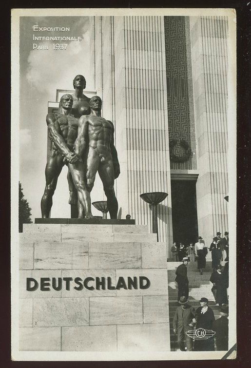 С высокого цоколя прямо на немецкий павильон триумфально надвигалась десятиметровая скульптурная группа.