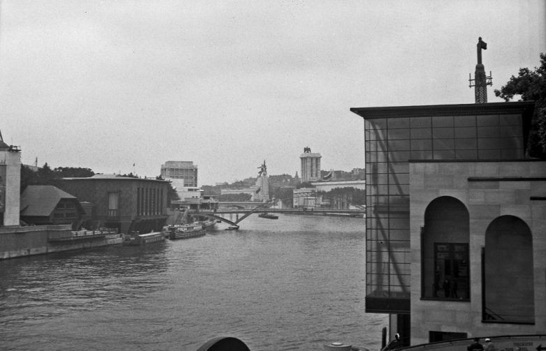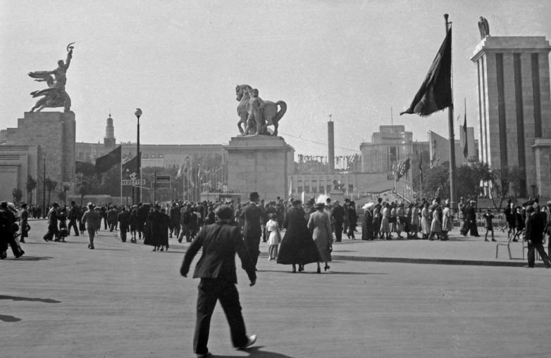 Прямо напротив 160-метровый блок немецкого павильона завершался такой же устремленной ввысь башней, увенчанной орлом со свастикой — символом нацистского государства.
