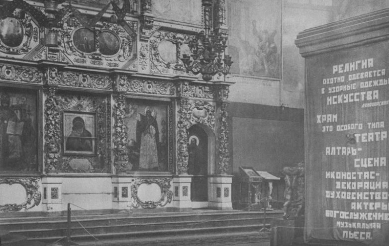 14. Эта церковь была закрыта, но её бесценные иконы и сокровища дают основания для её сокранения в качестве художественной галереи. Неудачные обстоятельства, но им противодействует огромный атеистический плакат справа.