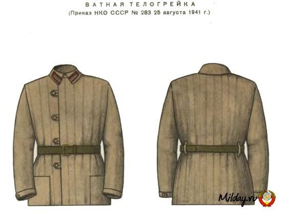 Приказом НКО № 283 от 1941 года был введен новый образец ватной телогрейки, которая в отличие от телогрейки старого образца, предназначавшейся к ношению под шинелью, теперь должна была носиться взамен шинели — то есть, командному составу выдавали шинель, рядовым — телогрейки.