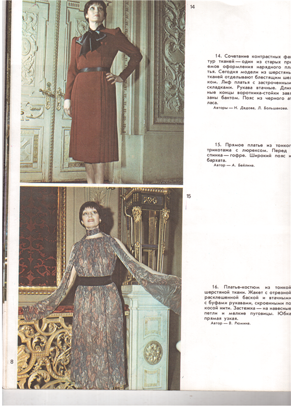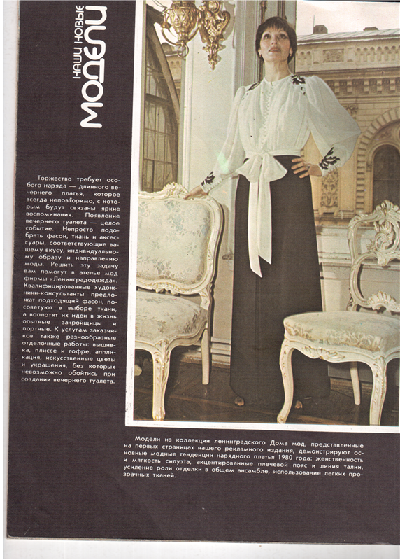 Осень вступает в свои права. Мы убираем подальше лёгкие летние платья, чтобы извлечь из шкафов уютные свитера и тёплые пальто. Впрочем, откладывать платья в долгий ящик всё же не стоит — и осенью для них найдётся место и время! Так утверждают дизайнеры Ленинградского дома мод, представляя Вашему вниманию осеннюю коллекцию 1980 года.