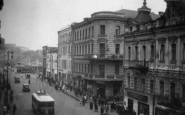 4. Идём дальше к центру города. Улица Горького у Палашёвского переулка, 1934. Поди-ка, опознай теперь это место без спецподготовки. Вообще очень космополитичный вид. Если не приглядываться — можно принять и за Варшаву, и за Будапешт: