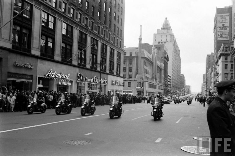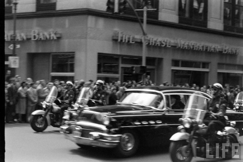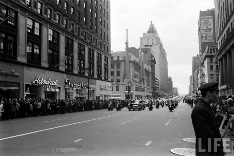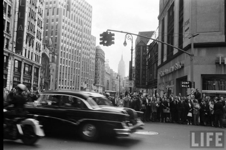 Итак, начнем со снимков Эла Фенна, отразившего атмосферу в Нью-Йорке в момент приезда Никиты Сергеевича и сам проезд кортежа по улицам. Кстати, на этих снимках, вы можете заметить и барражирующий над городом вертолет. Все как и сейчас.