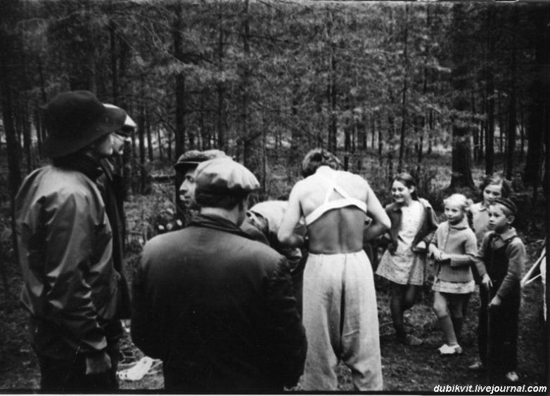 «Сибириада».Слева Андрон Кончаловский наблюдает, как готовятся каскадёры прыгать с макушки сосны на сосну
