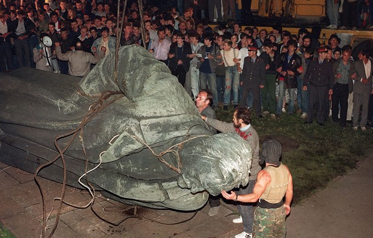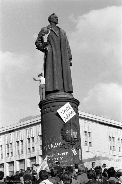 Доложили, что с какой-то машины в проезде Серова, то есть рядом с комитетом, бесплатно раздают водку. Любой бунт в России совершается с помощью водки, это очень опасная вещь. Прошу немедленно проверить. Через несколько минут разочарованный голос сообщает, что сведения не подтвердились, водку не раздают. Ситуация постепенно проясняется. На площади не буйная толпа, а организованный митинг. Всем распоряжается молодой и многообещающий политический деятель Станкевич, милиция появилась и приглядывает за порядком, идёт подготовка к демонтажу памятника Ф.Э. Дзержинскому.