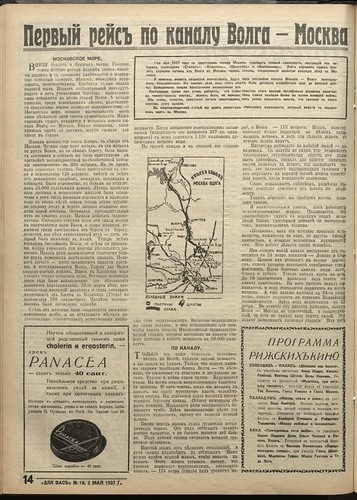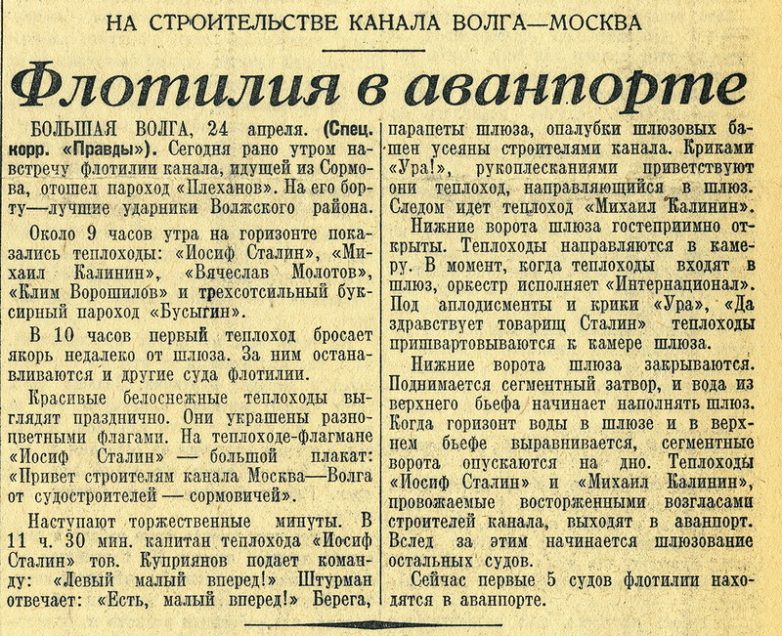 Газета 'Правда' №114 (7080) 25 апреля 1937«Флотилия канала Москва-Волга прошла шлюз №1» – под таким названием появилась передовица в районной газете «Ударник». Как следует из статьи, около 8 часов утра буксирный пароход «Плеханов» вышел от Иваньковской пристани в Волгу навстречу флагману флотилии — теплоходу «Иосиф Сталин». Его борт украшен плакатом «Привет строителям канала «Москва-Волга» от судостроителей-сормовичей». Другие корабли флотилии – «Михаил Калинин». «Вячеслав Молотов». «Клим Ворошилов» сопровождались мощным буксирным пароходом «Бусыгин».
