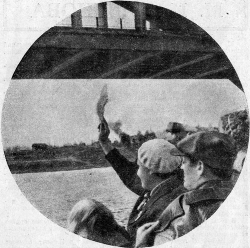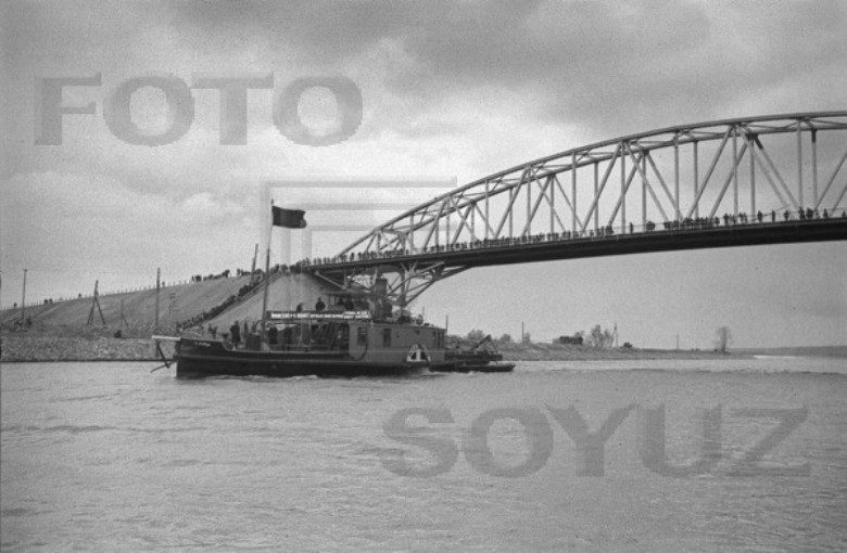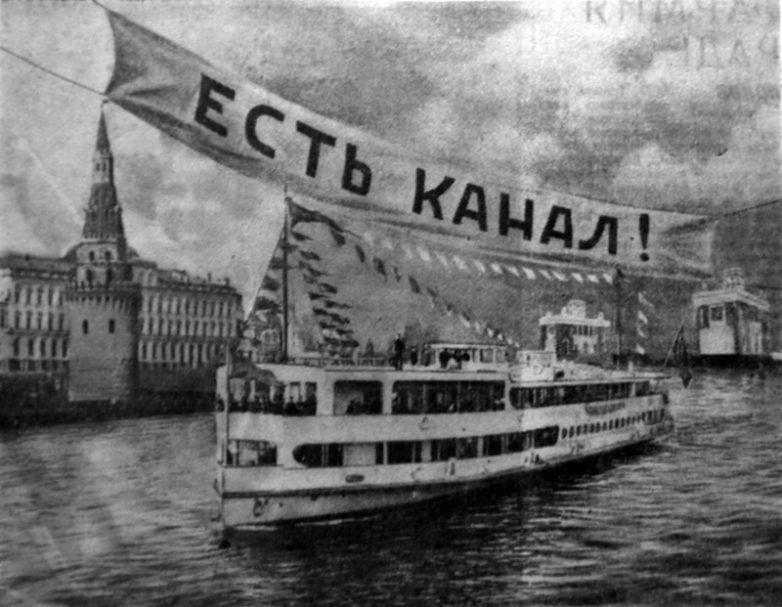 К Химкинскому речному вокзалу подошла первая флотилия канала Москва-Волга. Ровно в 12 часов флагманское судно – волжский теплоход «Иосиф Сталин» остановился у пристани. Тысячи трудящихся Москвы встречала первую флотилию судов. Среди встречавшихся товарищ Хрущев, нарком водного транспорта товарищ Пахомов, начальник строительства канала товарищ Берман, товарищи Филатов, Булганин, Богомолов.