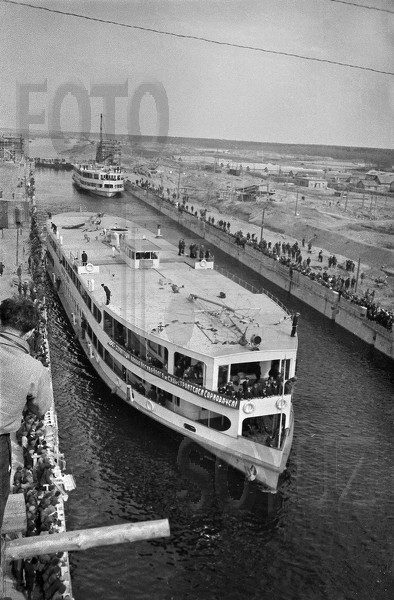 В 11 часов 30 минут капитан теплохода «Иосиф Сталин» товарищ Куприянов подает команду: «Левый малый вперед!». Штурман отвечает: «Есть, малый вперед! Берега парапета шлюза, опалубка шлюзовых башен усеяны, строителями канала. Криками «Ура!», рукоплесканиями приветствуют они теплоход, направляющий в шлюз. Следом идет теплоход «Вячеслав Молотов». Нижние ворота шлюза гостеприимно открыты. Теплоходы направляются в камеру. В момент, когда теплоходы входят в шлюз, оркестр исполняет «Интернационал» Под аплодисменты и крики «Ура!», «Да здравствует товарищ Сталин» теплоходы пришвартовываются к камере шлюза. Нижние ворота шлюза закрываются. Поднимается сегментный затвор, и вода из верхнего бьефа начинает наполнять шлюз. Когда горизонт воды в шлюзе и в верхнем бьефе выравнивается, сегментные ворота опускаются, на дно. Теплоходы «Иосиф Сталин» и «Вячеслав Молотов» провожаемые восторженными возгласами строителей канала, выходят в аванпорт. Вслед за этим начинается шлюзование остальных судов. Сейчас первые 5 судов флотилии находятся в аванпорте.