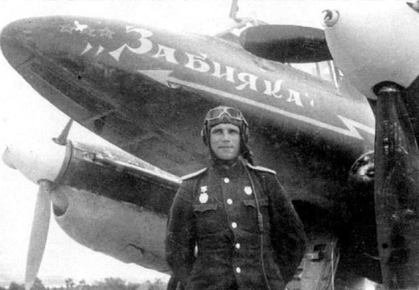 Лейтенант Забияка Г.И. на фоне именного Пе-2 205-й серии. Надпись «Забияка» белого цвета, молния – желтого