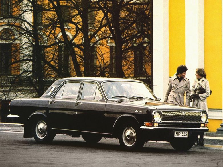 ГАЗ-24 «Волга». Советский автомобиль среднего класса, серийно производившийся вместе с его модификацией ГАЗ-24-10 на Горьковском автомобильном заводе с 1968 по 1994 год. Дизайн автомобиля был достаточно стандартным для рубежа шестидесятых и семидесятых годов. По общим пропорциям и обводам кузова машина была ближе к американским образцам, но деталировка — бампера, светотехника — была скорее европейской. Разработанные параллельно с «Волгой» поколения моделей европейского рынка выпускались с минимальными изменениями до середины 1970-х годов, а североамериканского — до конца того же десятилетия, так что до этого срока «Волга» выглядела вполне уместно в потоке автомобилей развитых стран.