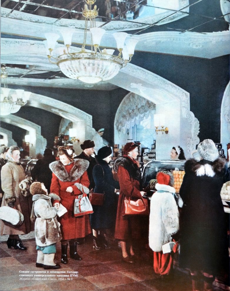 Ориентированный на зарубежного читателя журнал «Советский Союз» запечатлел в роскошных интерьерах ГУМа образцовую картину потребительского общества в СССР: