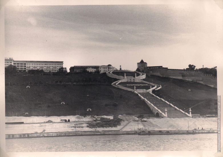 Горький. Вид с теплохода. Вдали: памятник В.П.Чкалову и Нижегородский Кремль — сооружение XVI века.