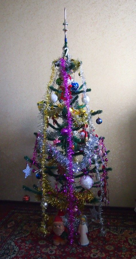 Мы такую же, как на первой фотке, ёлочку каждый год с тех пор ставим, вот и только сегодня поставили. Коробка тоже сохранилась, с надписью «Ёлка из ПВХ». И вешаем старые советские игрушки. Даже верхушка похожа. Правда, звездочку так и не удалось купить.