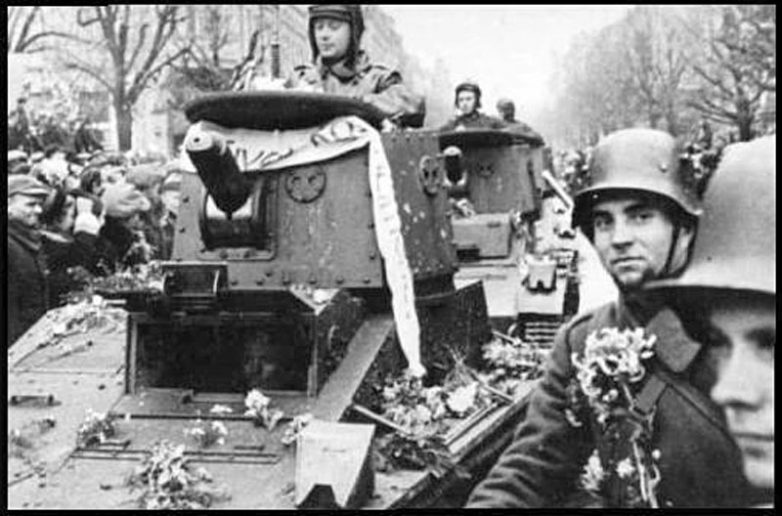 Перед нами пробежали захватывающие исторические кадры, когда народ, с любовью в сердце, встречал своих освободителей от проклятого капитала.
