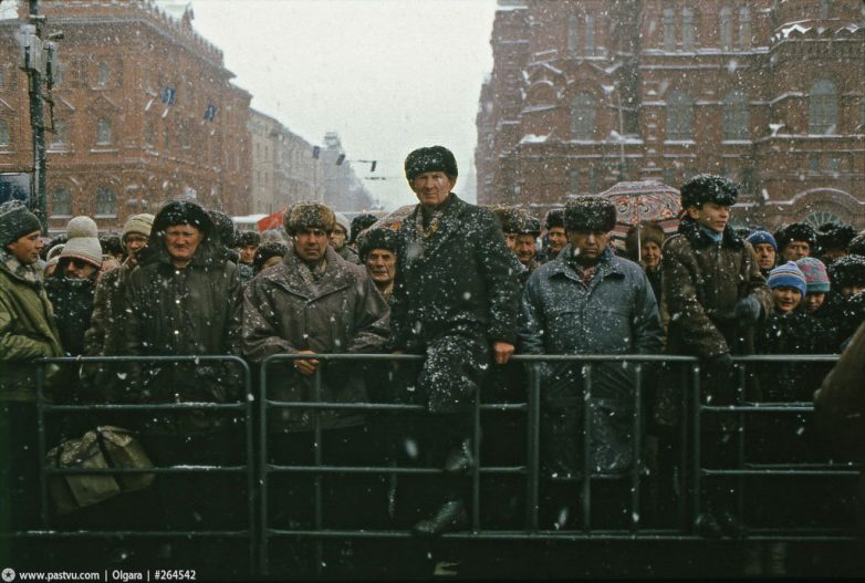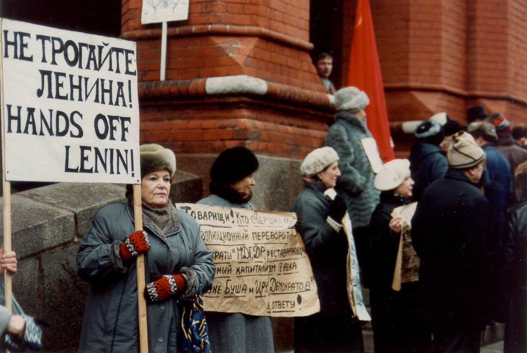 Митинг 7 ноября 1991 года. За месяц до ликвидации Советского Союза, в Москве прошла традиционная для этого дня демонстрация, посвященная очередной годовщине Октябрьской революции 1917 года. В тот день на улицы города вышли люди с разными политическими взглядами и стремлениями, вынесли самые разные флаги и плакаты с лозунгами. Американский турист Ray Cunningham сделал несколько фотографий демонстрантов.