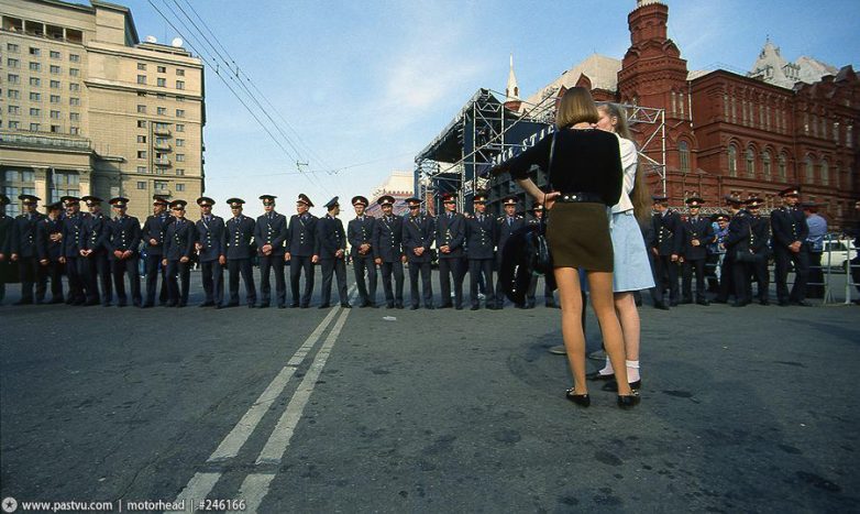 Страна уходит. От этих двоих. Два фанерных символа – один бывший, неудачник, а другой – новый, но уже явный дурак. Это – ассоциация. А так – все живут своей жизнью, кроме этих, хотя и живых, но с народной точки зрения – подпёртая фанера, понимаешь! Теперь мы знаем, кем подпёртая. Это – символическая фотография, это – не репортаж, поскольку тут одно чувство, и никакого события. А здорово, что все девицы к «фанерным» спиной, а одна – навстречу. Тогда этот взгляд – работает!