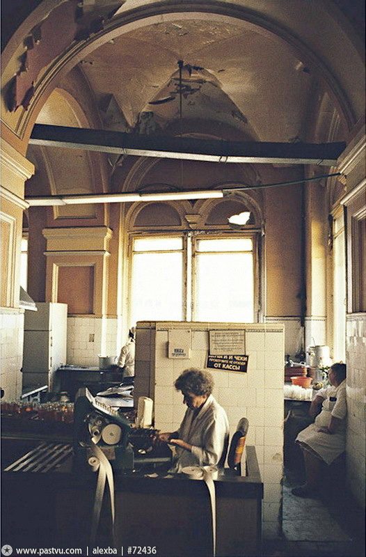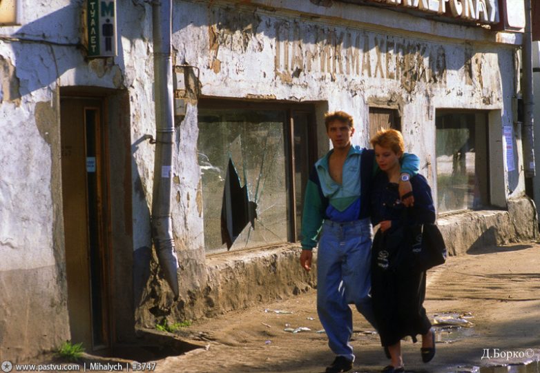 Магазин «Продукты» на Автозаводской улице. Это просто экстракт 1991 года: убогий пустой магазин, жуткая одежда, люди, убивающие время. Кажется, даже на автобусной табличке — три буквы: «НЕТ» (слово, наиболее подходящее к тому времени).