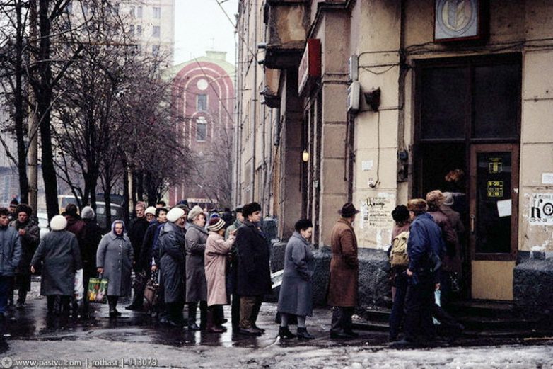 Из комментариев: «Такие очереди возникали, когда люди пытались запасти что-либо впрок! В те годы это была идея фикс. Балконы да и квартиры у большинства населения были забиты мешками с сухарями, которые они сушили, в свободное время из купленного надысь хлеба; коробками с крупой, макаронами; консервами. Готовились к голоду. Позже они весь это сухой паек, побитый долгоносиком, или Бог знает чем, по вечерам таскали на помойку.»