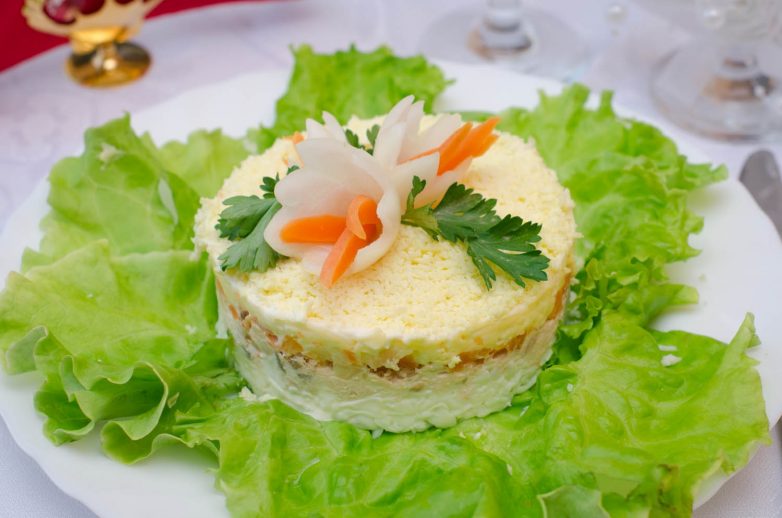 Если от пары ложек оливье вы все равно никогда не откажетесь, то вот мимоза — уже уровень серьезных гурманов. Неизвестно, кому в голову пришло, что измельченный яичный желток напоминает лепестки мимозы. Зато известно, что в салате одновременно умещаются сливочное масло, рыбные консервы, яйца и, конечно же, море майонеза.