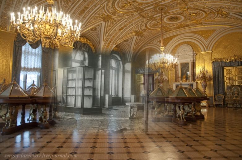 "— Тридцать два снаряда попало. Степень разрушения разная: снаряд в Гербовом зале упал где-то в двух метрах от Малого тронного зала. По каким законам баллистики, я не знаю, но осколки рванули сюда, в Малый тронный зал. В Гербовом зале дырка в полу вниз, в Растреллиевскую галерею, и больше ничего. А Малый тронный зал весь изрешечен осколками. Сбита люстра, ее не удалось восстановить — хрупкая очень бронза была… "
