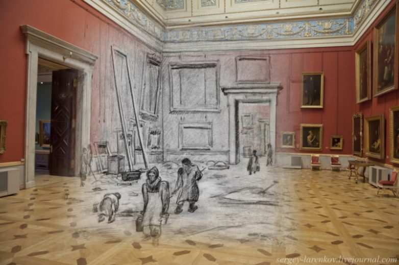 «С начала войны в бомбоубежища Эрмитажа были превращены многочисленные дворцовые подвалы. Сотрудники музея заложили низкие подвальные окна кирпичом, навесили железные двери, расставили столы и стулья, сколотили топчаны.